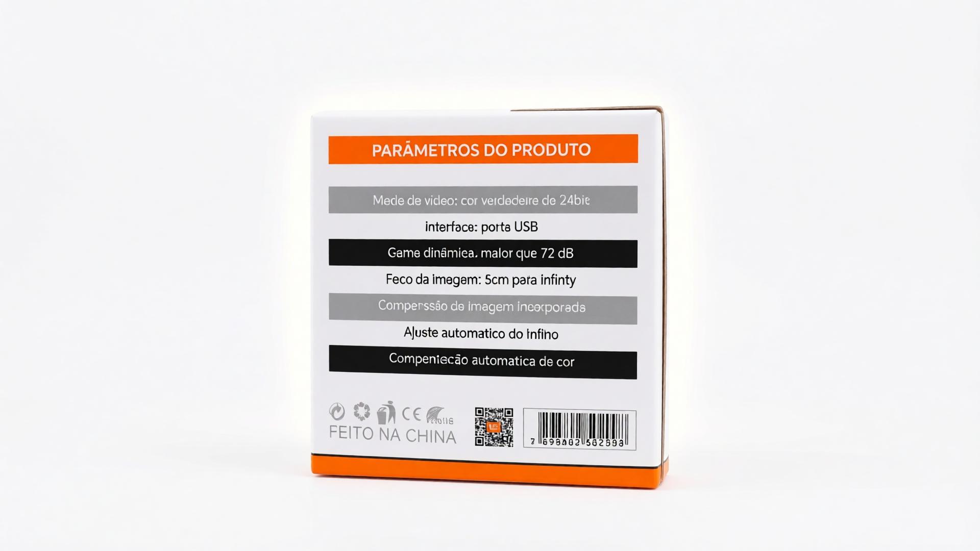 Alta definição, 72dB gama dinâmica, compressão automática de cor, feito na China com certificações CE. Código de barras no verso da embalagem.